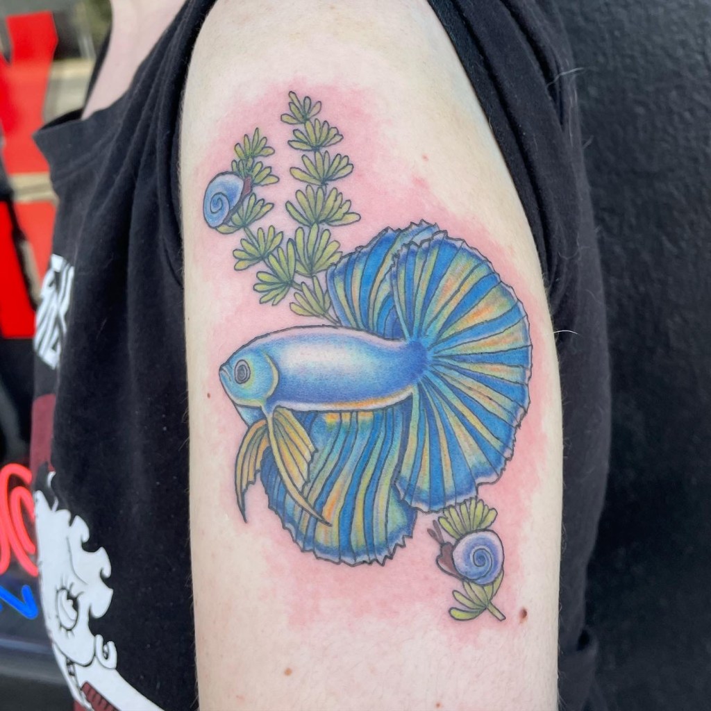 Outside of work, I enjoy antiquing, thrifting, and spending time with my girlfriend, Aaron. I love cartoons, toys, and all kinds of childhood nostalgia. I collect antiques, vintage furniture/clothes, stickers, toys, and art supplies. I love making earrings, ceramics, and other crafts in my spare time. Above all, my top priority as a tattoo artist is to make people happy and spread love and positivity. I hope we can have some fun collaborating on a project together, hopefully very soon 🙂 Thank you for stopping by!