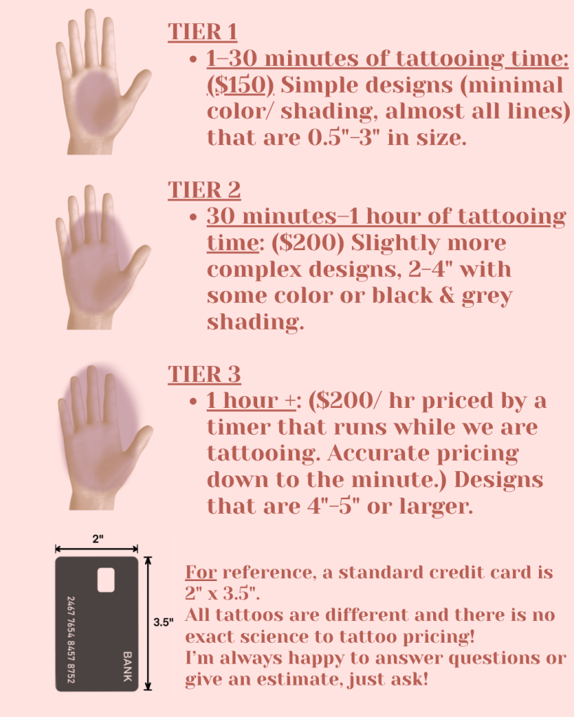I require a deposit of $100 to secure an appointment time and compensate for my time spent designing the tattoo. This deposit goes towards the final cost of your tattoo. This deposit is NON-Refundable, even in the event of an emergency. I accept deposits via Venmo, Cashapp, and Paypal, or you can pay in person with Cash. You can find my payment information here.